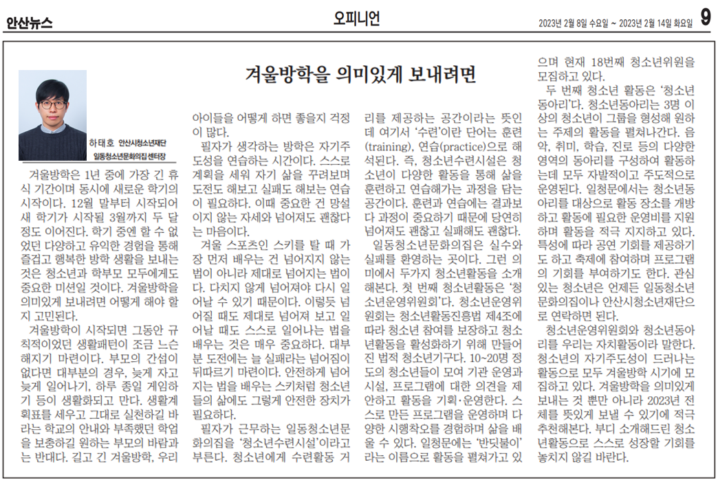 겨울방학은 1년 중에 가장 긴 휴식 기간이며 동시에 새로운 학기의 시작이다. 12월 말부터 시작되어 새 학기가 시작될 3월까지 두 달 정도 이어진다. 학기 중엔 할 수 없었던 다양하고 유익한 경험을 통해 즐겁고 행복한 방학 생활을 보내는 것은 청소년과 학부모 모두에게도 중요한 미션일 것이다. 겨울방학을 의미있게 보내려면 어떻게 해야 할지 고민된다.