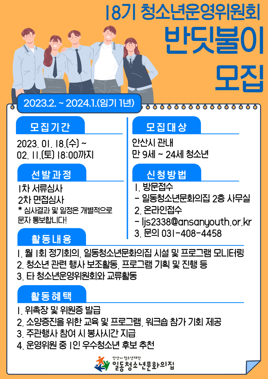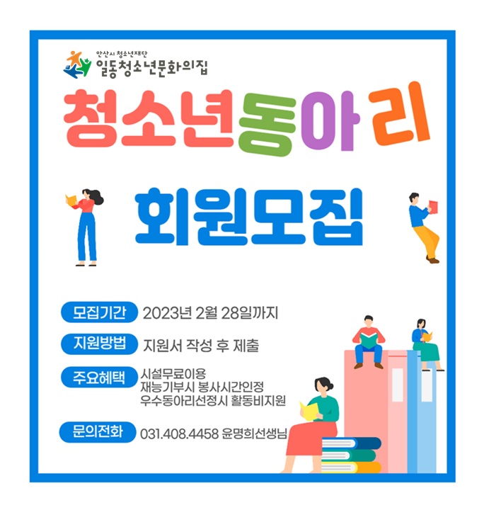 - 모집기간 : 2023.02.28까지 - 참여대상 : 3인 이상의 청소년(9~24세) 그룹 - 활동주제 : 음악, 취미, 봉사, 학습, 기타 다양한 분야의 주제 - 주요혜택 : 시설 무료이용, 재능기부시 봉사시간 인정, 우수동아리 선정시 활동비 지원 등 - 신청방법 : 지원신청서 작성 후 제출 - 제출기관 : 일동청소년문화의집 - 문의전화 : 031-408-4458(조이쌤)