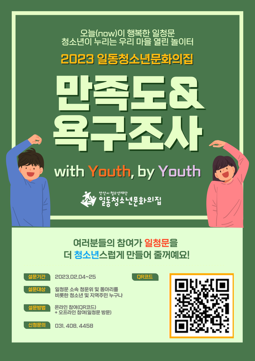 - 조사기간 : 2023.2.4(토) ~2.25(토) - 조사대상 : 이용 청소년 및 지역주민 누구나 - 조사방법 : QR코드(온라인) 조사