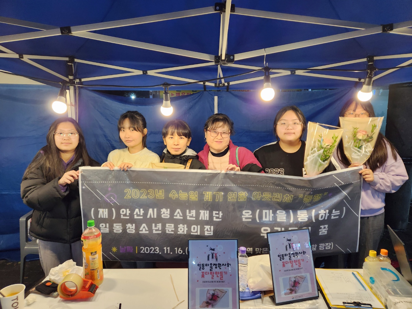 2023 수능날, 중앙역에 안산 관내 청소년기관들이 모두 모였어요. 일청문도 수능일 계기 연합 아웃리치 '동행'이란 이름 아래 진행되었던 이번 행사에 일동 마을정원사님과 부스 운영으로 함께했는데요. 청소년들이 수능의 해방감을 느끼고 청소년기의 아름다움을 간직할 수 있도록 꽃다발을 만들며 시간을 보냈습니다. 그렇게 그날 전했던 메시지를 한번 더 외쳐봅니다. "수험생 여러분, 고생 많으셨습니다!" 👏