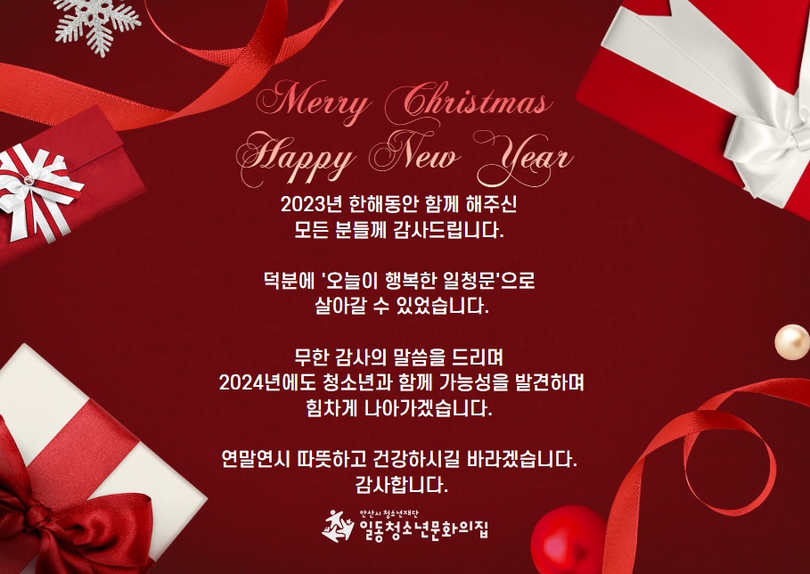 어느덧 12월, 2023년의 마지막 달입니다. 어떻게 보내고 계신가요? 일청문지기는 2023년을 돌아보면서 '뿌듯함'이란 감정이 가장 먼저 생각납니다. 1월부터 12월까지 다양한 청소년활동으로 만나온 우리 청소년들의 성장을 볼 수 있어서, 우리 마을 일동의 구성원으로 살아갈 수 있어서, 덕분에 오늘이 행복할 수 있어서 참 고맙고 감사한 마음과 함께 뿌듯함이 큽니다. 특히 올해 처음으로 일청문의 뉴스레터가 발간되면서 우리 소식을 가장 빠르고 편하게 전하며 기록으로 남길 수 있어서 그 뿌듯함이 깊게 남아있는데요. 보시는 분들에게도 일청문의 마음이 잘 전달되었으면 좋겠습니다. 뿌듯함 가득한 12월, 꿈틀꿈틀과 함께 행복하고 따뜻한 연말 되세요!