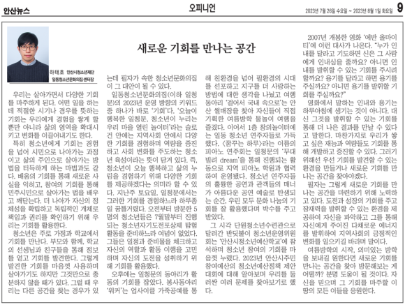 우리는 살아가면서 다양한 기회를 마주하게 된다. 어떤 일을 하는 데 적절한 시기나 경우를 뜻하는 기회는 우리에게 경험을 쌓게 할 뿐만 아니라 삶의 영역을 확대시키고 변화를 이끌어내기도 한다. 특히 청소년에게 기회는 경험을 넘어 시민으로 나아가는 과정이고 삶의 주인으로 살아가는 방법을 터득하게 하는 마법과도 같다. 배움의 기회를 통해 새로운 사실을 익히고, 참여의 기회를 통해 민주시민으로 살아가는 법을 배우고 깨닫는다. 더 나아가 자신의 정체성을 확립하고 독립적인 개체로 책임과 권리를 확인하기 위해 우리는 기회를 활용한다. (중략) 2007년 개봉한 영화 ‘에반 올마이티’에 이런 대사가 나온다. “누가 인내를 달라고 기도하면 신은 그 사람에게 인내심을 줄까요? 아니면 인내를 발휘할 수 있는 기회를 주시려 할까요? 용기를 달라고 하면 용기를 주실까요? 아니면 용기를 발휘할 기회를 주실까요?” 영화에서 말하는 인내와 용기는 하루아침에 생기는 것이 아니다. 대신 그것을 발휘할 수 있는 기회를 통해 더 나은 결과를 만날 수 있다고 말한다. 마찬가지로 우리가 쌓고 싶은 재능과 역량들도 기회를 통해 개발하고 증진할 수 있다. 그러기 위해선 우선 기회를 발견할 수 있는 환경을 만들거나 새로운 기회를 만나는 공간을 찾아야겠다. 필자는 그렇게 새로운 기회를 만나는 공간을 마련하기 위해 노력하고 있다. 도전과 성장의 기회를 주고 잠재력을 발휘할 수 있는 환경을 제공하여 자신을 파악하고 그를 통해 자신에게 주어진 다채로운 에너지를 발휘하여 지역사회의 긍정적인 변화를 일으키길 바라며 말이다. 여름방학의 시작, 의미있는 방학을 보내길 원한다면 새로운 기회를 만나는 공간을 찾아 방문해보는 게 어떨까? 분명 도움이 될 것이다. 자신을 믿으며 그 기회를 마주할 이 땅의 모든 이들을 응원한다.