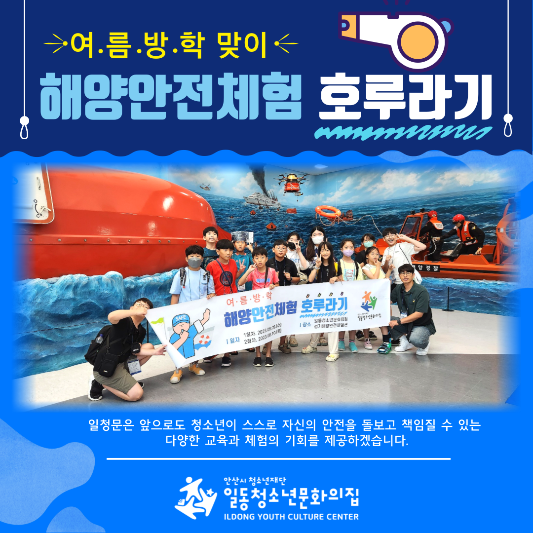 일청문은 최근 '호루라기'라는 이름의 해양안전체험을 실시했어요. 여름철 해양안전을 이해하기 위해 모둠활동을 하기도 하고 퀴즈를 풀어보기도 했죠. 그리고 대부도에 위치한 경기해양안전체험관을 찾아 해양안전4D체험, 해양안전가상체험을 하며 스스로 살아남는 법을 익혔습니다. 더불어 침수선박탈출체험과 생존수영을 통해 해양안전사고를 대비하는 시간을 갖기도 했는데요. 청소년활동을 통해 안전을 대비하고 실천하도록 더 노력하겠습니다.⛑️