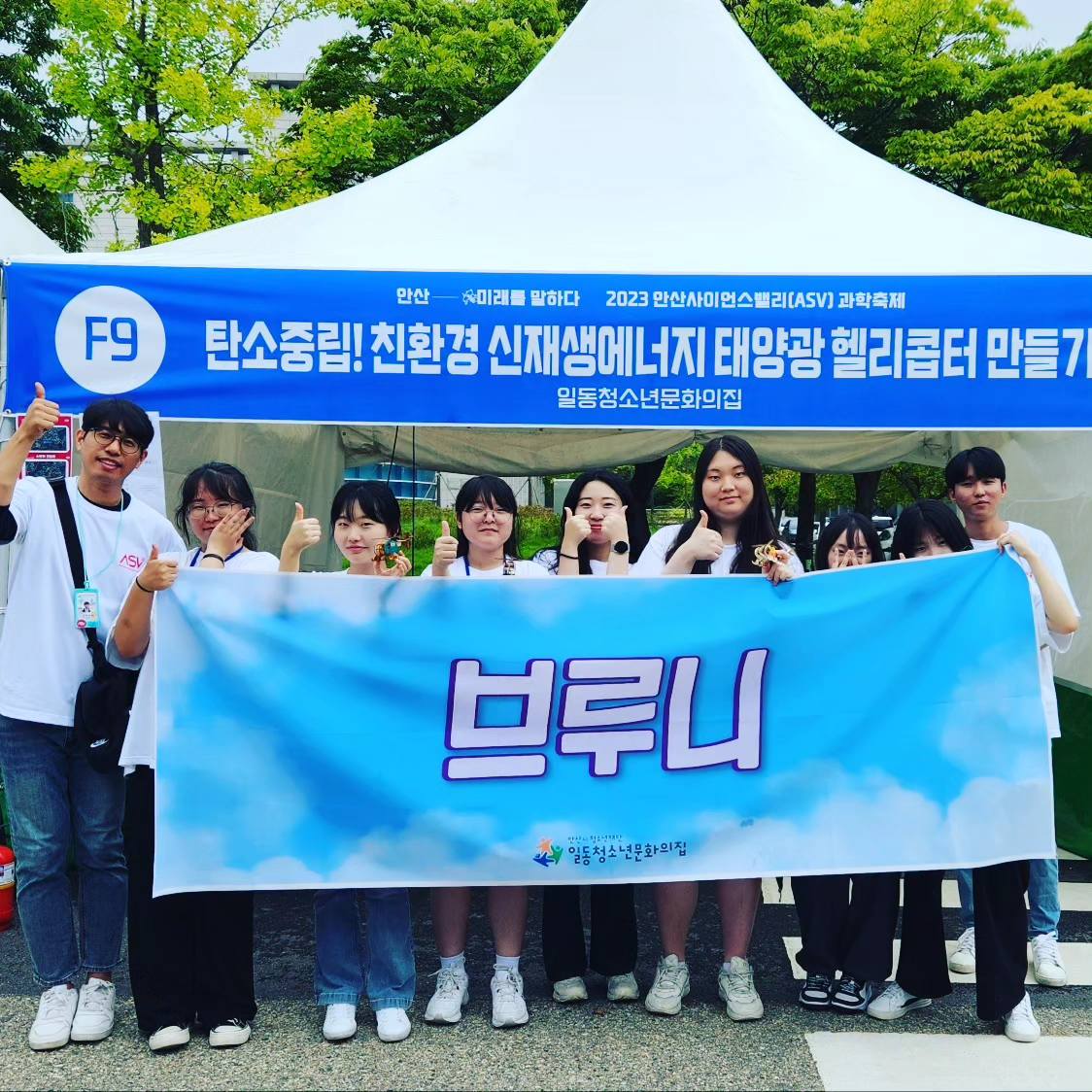 9월 16~17일, 이틀동안 한양대 에리카 캠퍼스에서 진행된 2023 안산사이언스벨리(ASV) 과학축제에 우리 일동청소년문화의집 동아리 <브루니>가 체험부스 운영으로 함께했습니다. 친환경에너지 태양광 헬리콥터 만들기 부스로 많은 청소년과 지역주민을 만났는데요. 비가 내리기도 하고 너무 덥기도 한 날씨 속에서 멋진 활동 보여준 우리 브루니, 참 멋있었습니다. 🫶