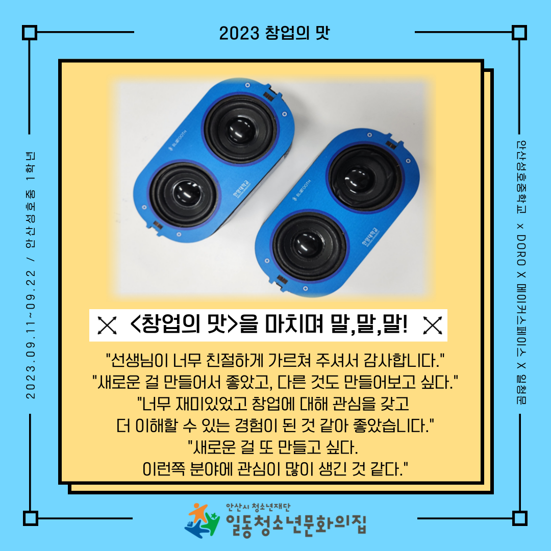 진로에 대한 고민이 많은 청소년을 대상으로 일청문은 안산성호중과 함께 <창업의 맛> 프로그램을 진행하였습니다. 대학생 창업가 DORO, 메이커스페이스와의 연계하여 성호중학교 1학년 전교생에게 진로특강(창업)과 메이킹 활동(블루투스 스피커)을 펼쳤는데요. 어떤 활동이었는지 자세한 내용은 뉴스레터를 확인해주세요! ^_^⛑️