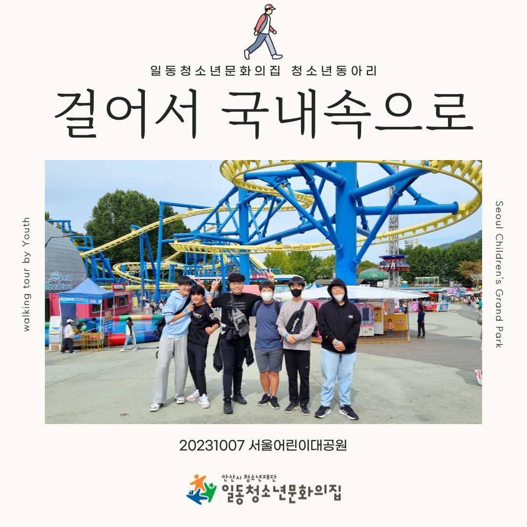 일청문의 여행동아리 <걸어서국내속으로>는 10월 활동으로 서울어린이대공원에 다녀왔습니다. 동물원과 식물원, 놀이동산 및 다양한 공연시설이 함께 있는 서울어린이대공원에서 청소년들이 의미있는 경험을 했는데요. 일청문은 앞으로도 청소년의 여가권 증진, 취미생활을 통한 스트레스 해소를 돕는 청소년활동을 꾸준히 펼치도록 노력하겠습니다. 💪