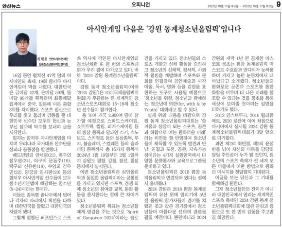 필자는 항저우 아시안게임을 마치며 우리나라 국가대표 선수단을 살피다 공통점을 발견했다. 배드민턴의 안세영(21), 축구의 정우영(24), 야구의 문동주(19), 탁구의 신유빈(19), 수영의 김우민(22), 양궁의 임시현(20) 등의 항저우 아시안게임 선수들이 모두 청소년기본법에 해당하는 청소년(9~24)이라는 점이다. 이들은 종목별 꿈나무에서 벗어나 각자의 자리에서 최선을 다하며 대한민국을 알렸고 대한민국의 자랑이 됐다. 그렇게 엄청난 퍼포먼스로 스포츠 역사에 각인된 아시안게임의 청소년처럼 또 한 번의 스포츠대회가 우리 곁에 다가오고 있다. 바로 ‘2024 강원 동계청소년올림픽’이다. 강원 동계 청소년올림픽(이하 ‘2024 강원’)은 IOC(국제올림픽위원회)가 주관하는 전 세계적인 청소년스포츠대회로 15~18세 청소년 선수들이 참가한다. 총 70여 개국 2,900여 명이 참가할 예정으로 스피드스케이팅, 쇼트트랙, 컬링, 피겨스케이팅 등의 빙상 종목과 알파인 스키, 스노보드, 스키점프 등의 설상종목, 루지, 봅슬레이, 스켈레톤 등의 슬라이딩 종목까지 총 15가지 종목이 2024년 1월 19일부터 2월 1일까지 강원도 평창, 강릉, 정선, 횡성 등지에서 실시된다. 이번 청소년올림픽은 성인올림픽과 동일한 올림픽이라는 공통점을 가지고 있지만 스포츠, 경쟁 외에 청소년의 참여와 교육, 문화 활동을 중시한다는 점에 큰 차이가 있다. 청소년올림픽 목표는 청소년들에게 영감을 주는 것으로 'Spirit of Gangwon 2024’이라는 슬로건을 가지고 있다. 청소년들의 스포츠 개발과 신체 활동을 증진하고 청소년의 신체적, 정서적, 사회적 웰빙을 개발하며 스포츠와 문화를 연결하여 공연예술과 시각 예술, 독서, 영화 등을 감정을 표현하는 도구로 사용될 예정으로 ‘청소년을 위한, 청소년과 함께하는, 청소년에 의한(for, with & by Youth)’ 대회라고 할 수 있다. ...(중략)... 2012 인스브루크, 2016 릴레함메르, 2020 로잔에 이어 처음으로 아시아에서 실시될 2024 강원 동계청소년올림픽대회가 3달 앞으로 다가왔다. 과연 제2의 최민정, 제2의 윤성빈을 넘어 자신의 이름을 당당히 알릴 주인공이 누가 될 것인지, 청소년의 스포츠 축제가 전 세계 모든 이들에게 어떤 방법으로 평화의 메시지를 전달할지 기대된다. 이글을 보는 당신과 그 기대를 함께하길 원한다. 그저 청소년들만의 잔치가 아니라 대한민국에서 열리는 세계적인 스포츠 축제인 2024 강원 동계 청소년올림픽대회에 많은 관심과 응원으로 또 한 번의 감동을 주고받길 희망한다.